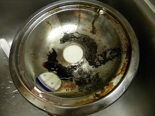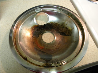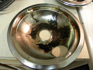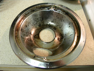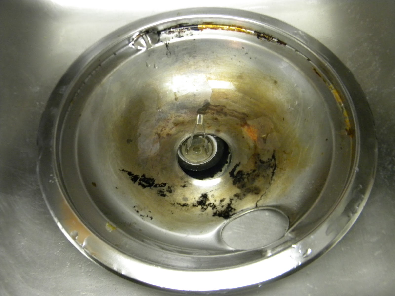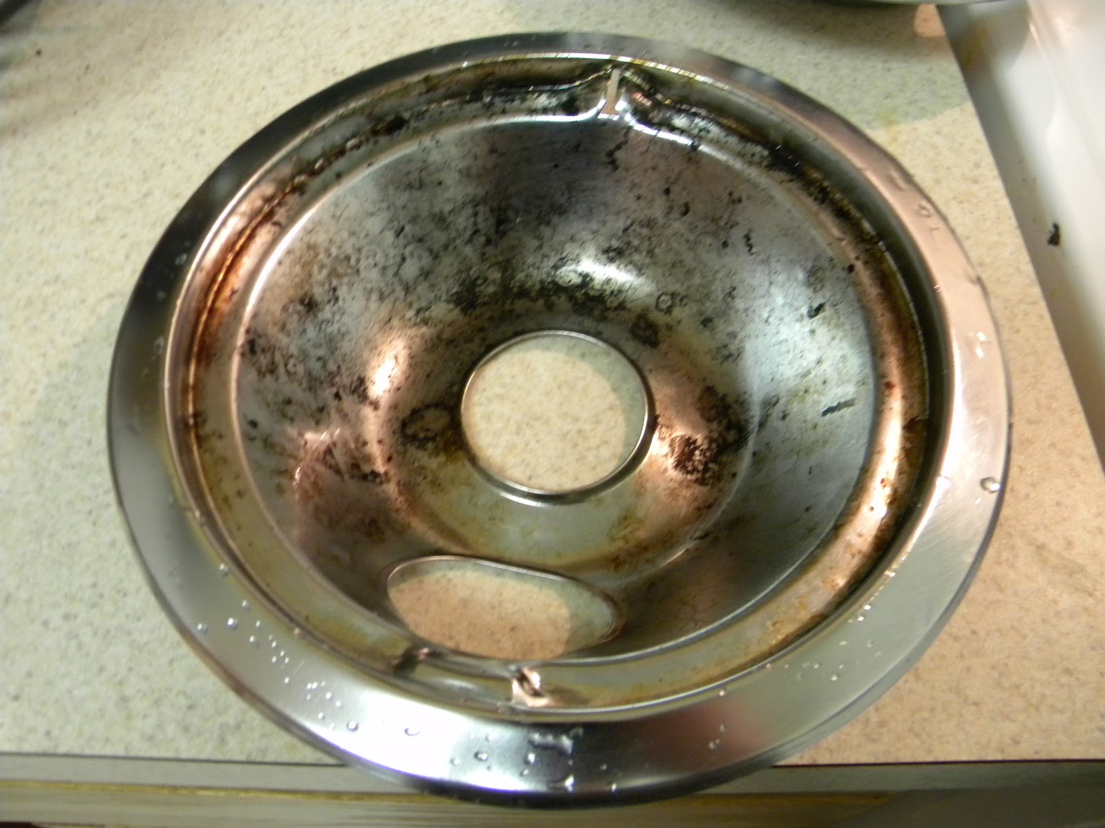 After all of the attempts, this one seemed to work the best, I left it on overnight and scrubbed in the morning. Unfortunately, this was the cleanest I could get it which would would still earn me a $40 damage charge when I move out. The dark black crud is just burnt on food which, if I really wanted to, I could scrub it off with a brillo pad. The light brown stuff is a stain in the surface which so far I have found nothing that would get rid of it. I would love to see if anyone has been more successful than I in cleaning their drip pans or if this really is a useless waste of energy as everyone tells me.